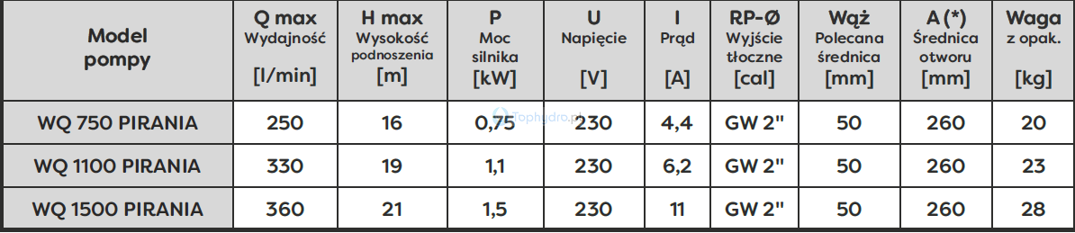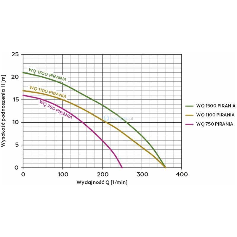Pompa zatapialna PIRANIA gwarantuje wysokie parametry pracy. Maksymalna wydajność na minutę to aż 330 litrów. Maksymalna wysokość podnoszenia 19 metrów. Model WQ 1100 PIRANIA to jeden z popularniejszych w kategorii pompy do szamba z rozdrabniaczem.